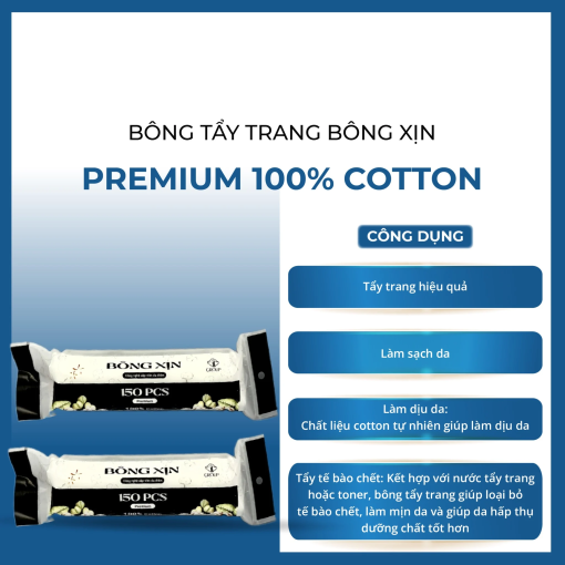 Bông Tẩy Trang Bông XịnPremium 100% Cotton là sản phẩm bông tẩy trang cao cấp được sản xuất tại Việt Nam, với 150 miếng trong mỗi hộp. Được làm từ 100% bông nguyên chất, sản phẩm có độ mềm và khả năng hút tốt, giúp dễ dàng loại bỏ bụi bẩn, bã bụi và lớp trang điểm trên da mà không gây kích ứng. Thiết kế bông dày, mềm mại, không gây xơ hay rát da khi sử dụng, phù hợp cho cả nhạy cảm.