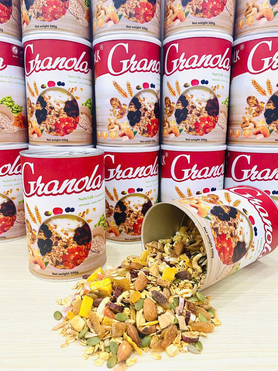 ▪️ Thành phần: Granola được làm từ Yến Mạch, Dừa Khô , Macca, Hạnh Nhân, Óc chó, Quả Việt Quất, Nho Khô, hạt bí Ấn Độ, Hoa quả Sấy Khô, Hạt Điều, ….
