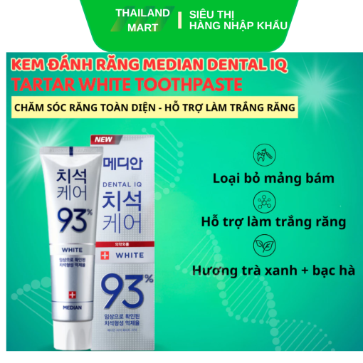 Kem Đánh Răng Giúp Trắng Răng, Giảm Ố, Loại Bỏ Mùi Hôi Median Dental IQ 93% Toothpaste là dòng sản phẩm chăm sóc răng miệng mang đến tác dụng ngừa vi khuẩn gây ra hiện tượng cao răng, răng ố vàng lên đến 93% cho người dùng một hơi thở thơm tho, giảm thiểu tình trạng hôi miệng đến từ thương hiệu Median thuộc tập đoàn Amore Pacific của Hàn Quốc.