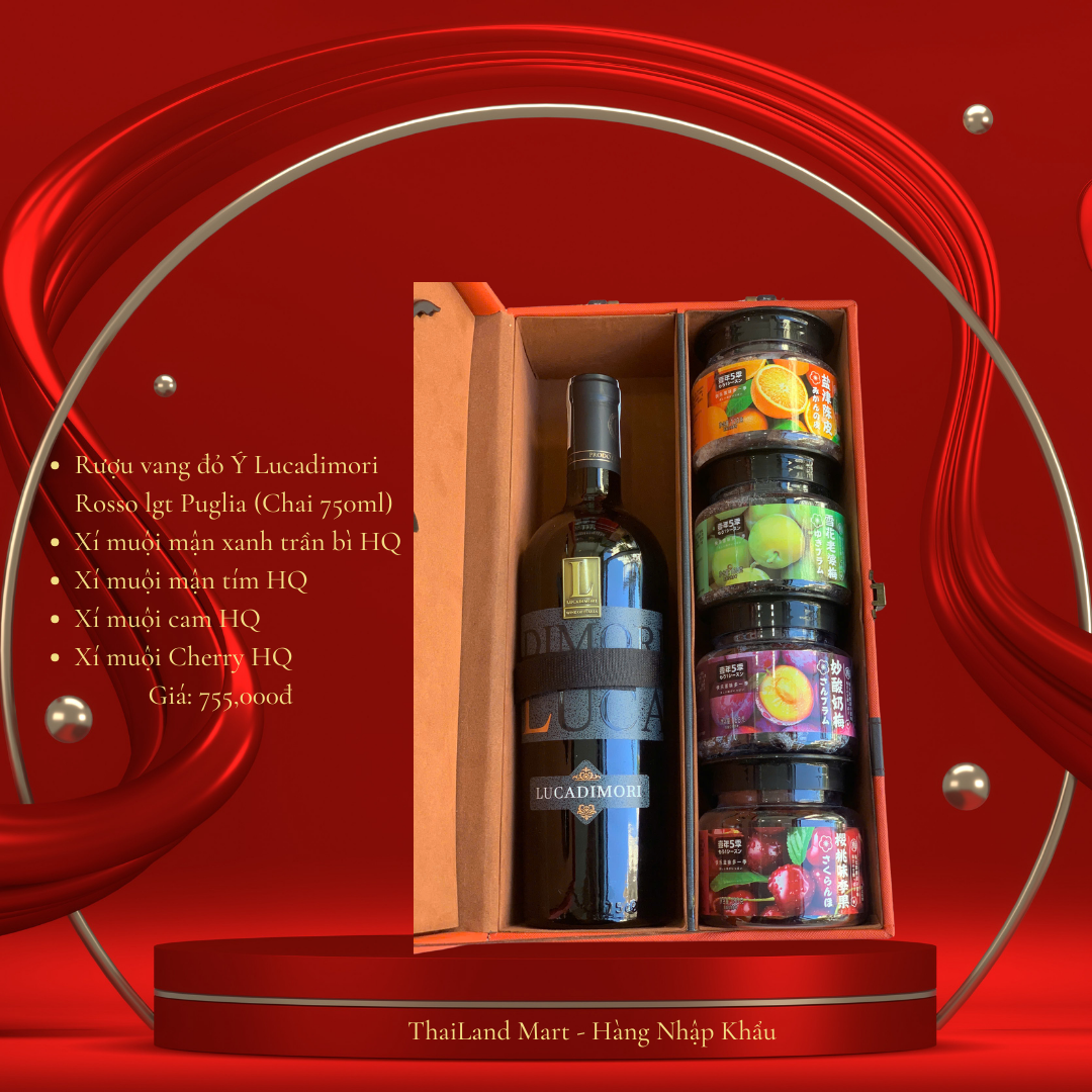 Bao gồm: Rượu vang Ý Lucadimori 750ml + 4 hũ xí muội Hàn Quốc